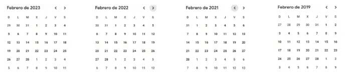 Calendarios de febrero en 2023, 2022, 2021 y 2019; en todos los siete días de la semana se suceden cuatro veces