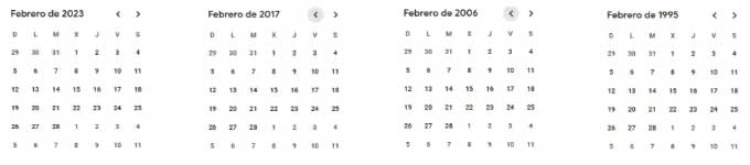 Calendarios de 2023, 2017, 2006 y 1995, donde la disposición de días del mes de febrero fue idéntica.