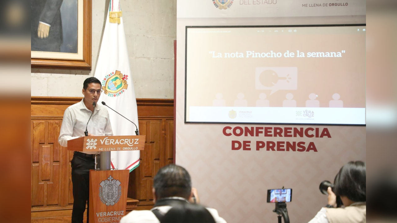 Xalapa, Ver.- Durante la conferencia del gobernador Cuitláhuac García Jiménez, el director general de Información Institucional, Luis Alberto Casas, presentó la nota Pinocho de la semana donde evidenció la falta de rigor periodístico de Oliva Radio que señaló al Gobierno estatal de obligar a sus empleados a participar en la celebración del presidente Andrés Manuel López Obrador por cinco años de gobierno.