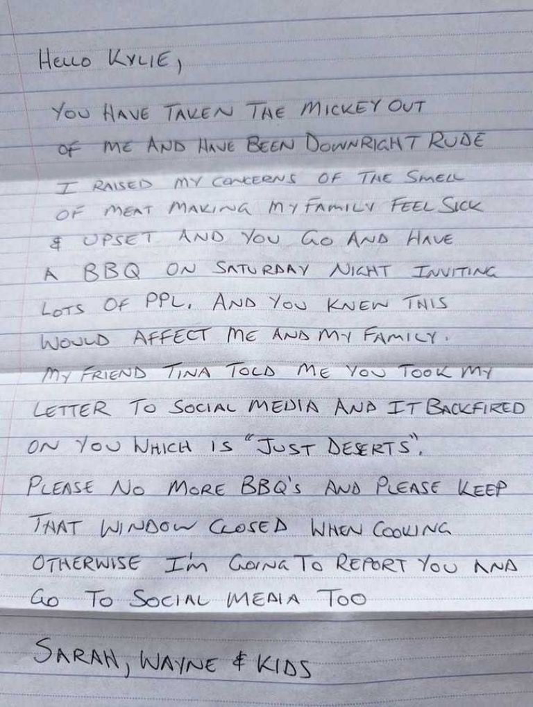 A través de sus redes sociales, un hombre australiano identificado bajo el nombre de Kylie, compartió en su página de Facebook una carta que recibió de sus vecinos, quienes se quejaban de las carnes asadas que realizaba y les pedía, profundamente, que pararán con ello, puesto que se trataba de un acto que molestaba a toda su familia.