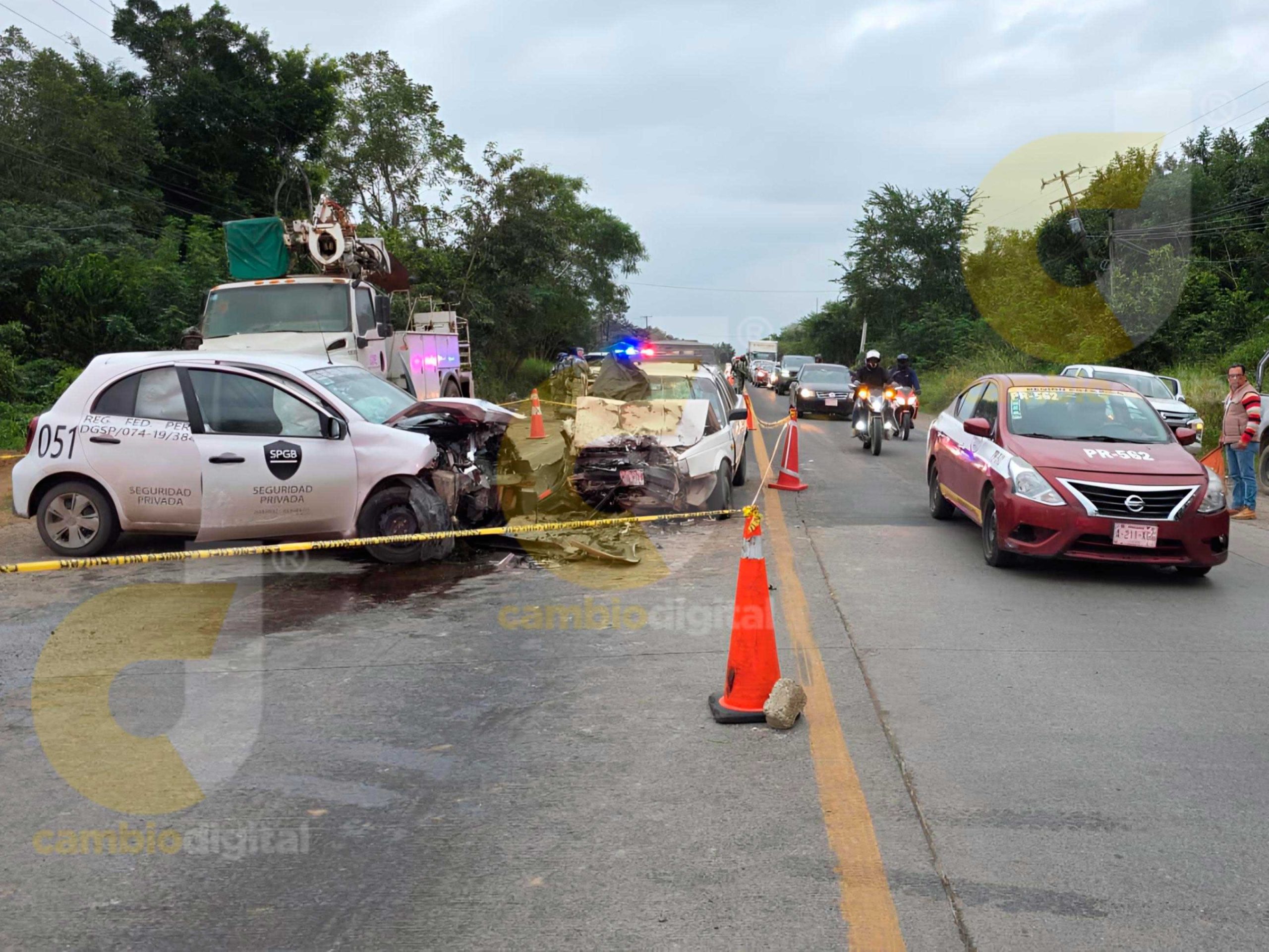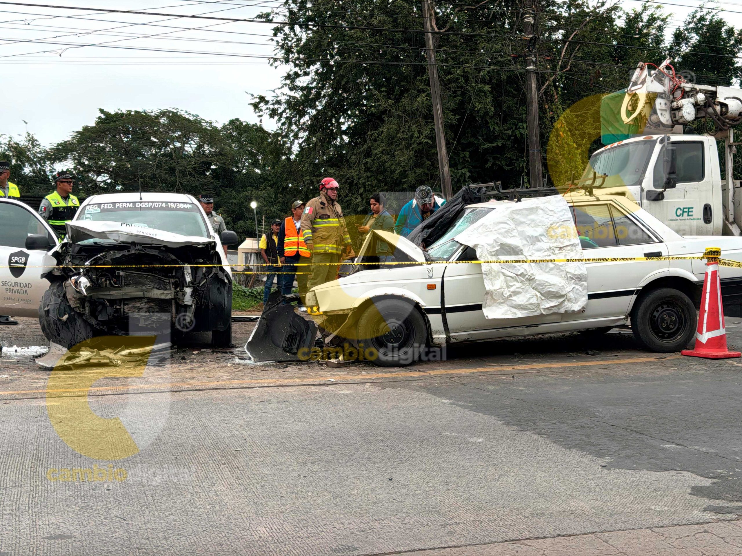 Resultando involucrados los conductores de un automóvil Nissan Tsuru color blanco, con placas del Estado de Veracruz y de un Nissan March; perteneciente a la empresa de seguridad privada SPGB.