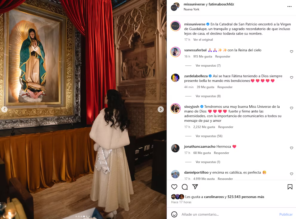 "En la Catedral de San Patricio encontró a la Virgen de Guadalupe, un tranquilo y sagrado recordatorio de que incluso lejos de casa, el destino todavía sabe su nombre", publicó la Organización de Miss Universo en Instagram.