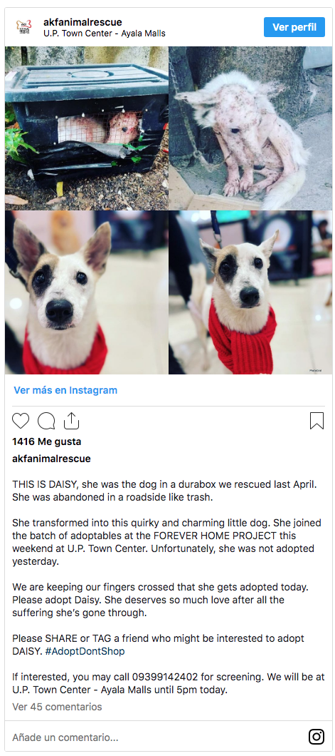 Heidi M. Caguioa, directora del programa de AKF, compartió que “cuando se le acercó, Daisy estaba callada; parecía aterrorizada y confundida. Posiblemente ya se siento indiferente sobre lo que le pasaría” y que ahora está mejor.
