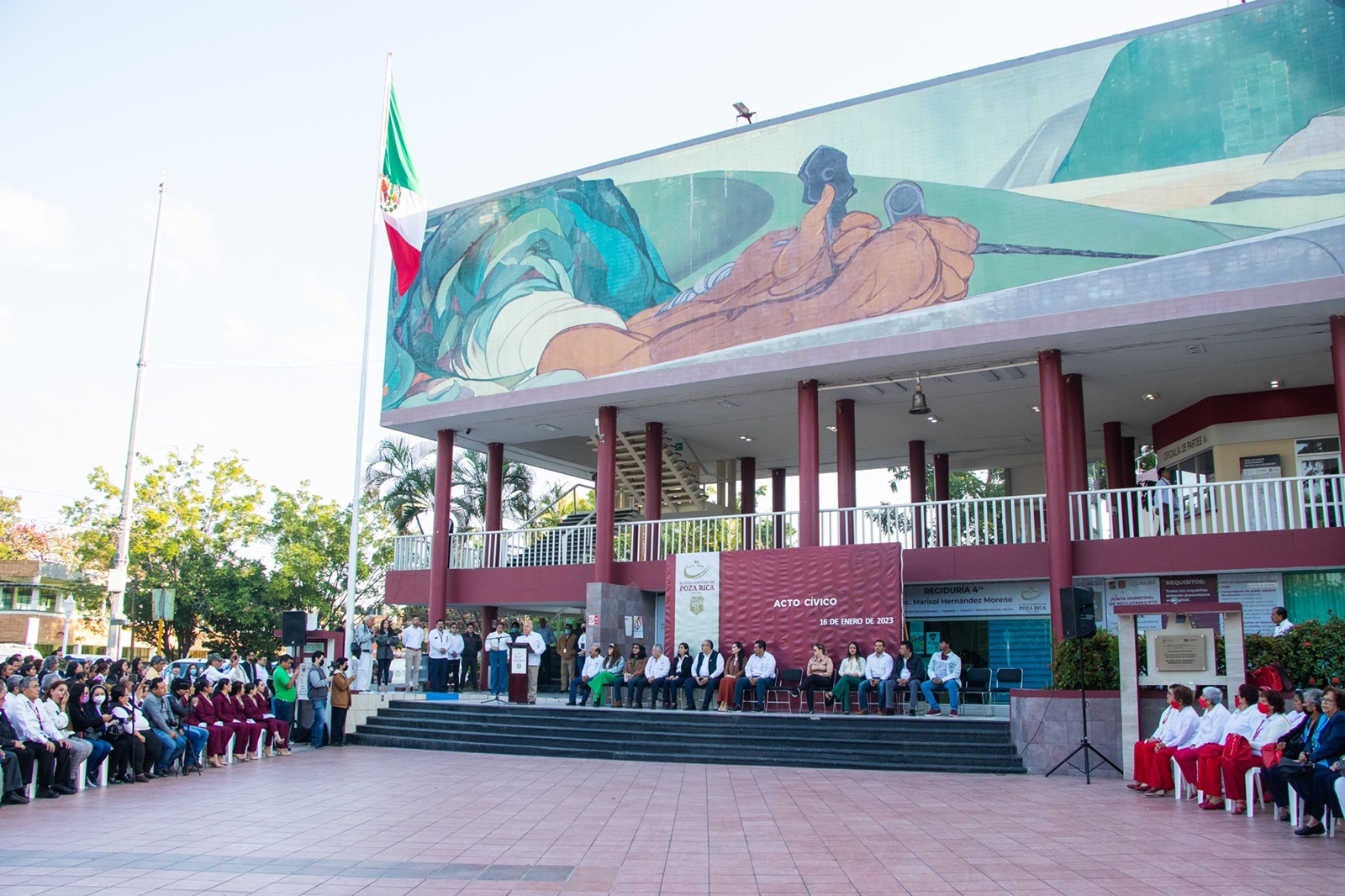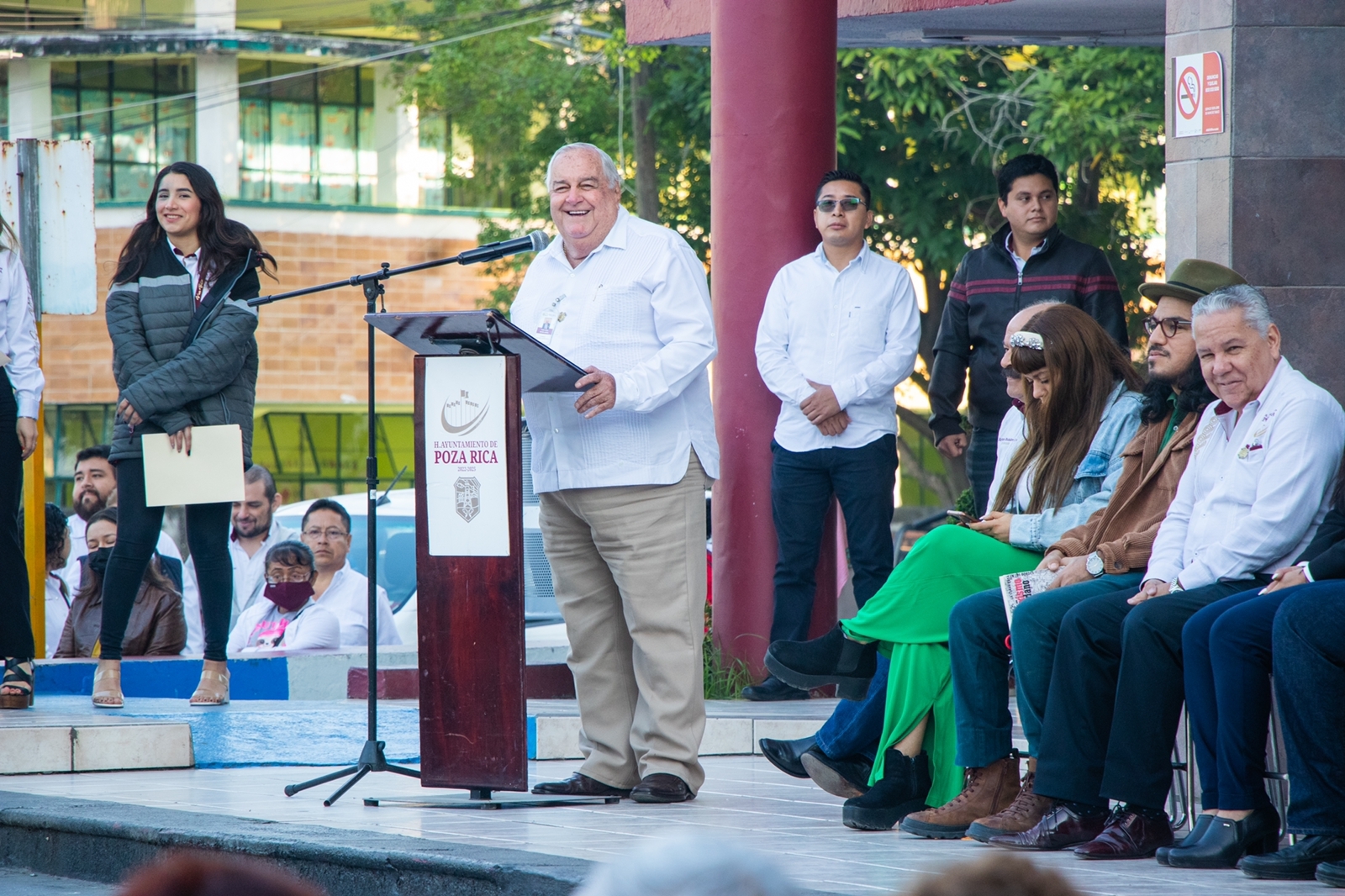 Poza Rica, Ver. – En el marco del acto cívico de este lunes el alcalde de Poza Rica, Fernando Remes Garza, refrendó su compromiso de continuar la transformación de Poza Rica a través de obras públicas, para mejorar la calidad de vida de su población, la imagen de la ciudad e impulsar el turismo.