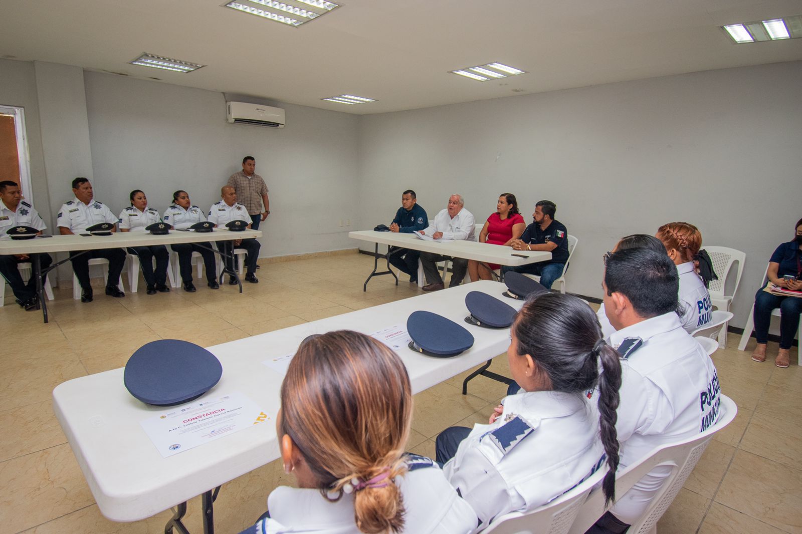 En la entrega de constancias estuvieron presentes la regidora cuarta, Marisol Hernández Moreno; el director de Prevención del Delito y Seguridad Pública Municipal, Julio Roberto Christfield Torres y el comandante de la policía municipal, Sebastián Antonio Cruz.