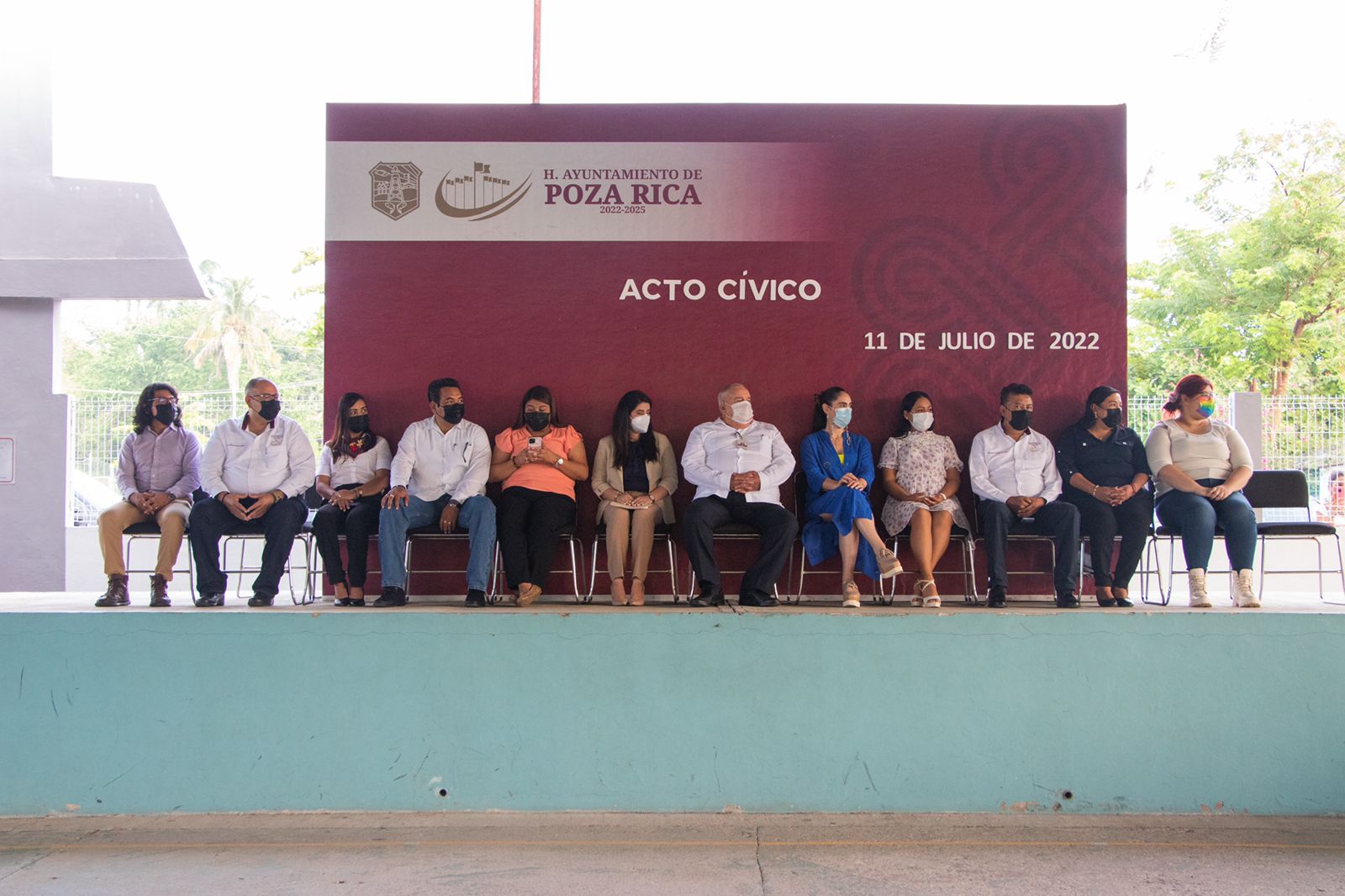 Poza Rica, Ver. – El alcalde de Poza Rica, Fernando Remes Garza, acompañado de los integrantes del cuerpo edilicio, así como maestros y alumnos de la escuela Primaria Art. 123 Ing. José Colomo Corral, rindió honores a la bandera y compartió un mensaje sobre la importancia de la unidad como requisito fundamental para transformar a Poza Rica.
