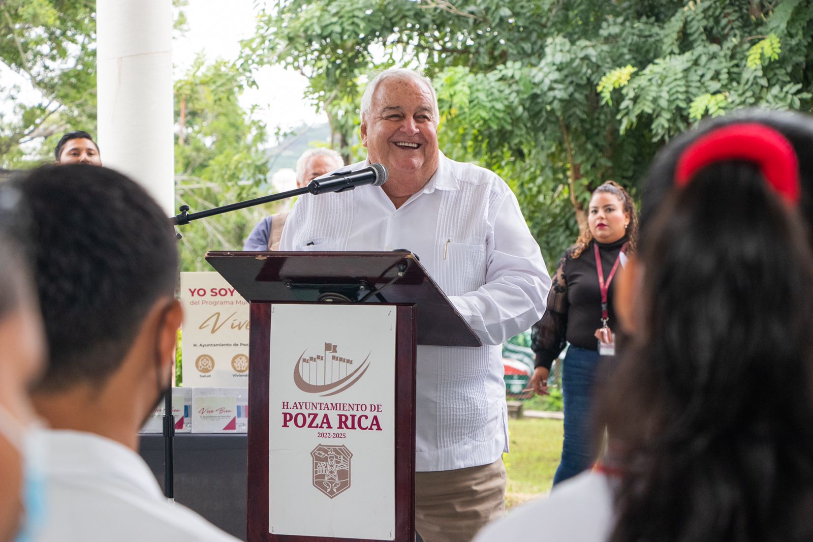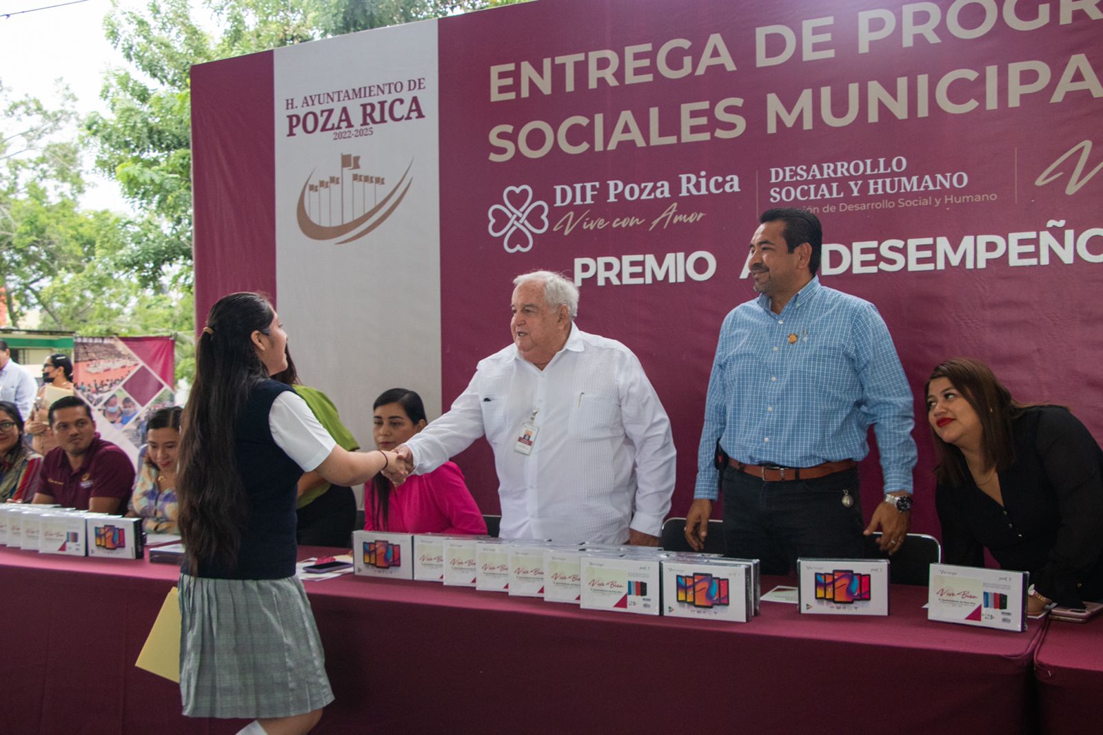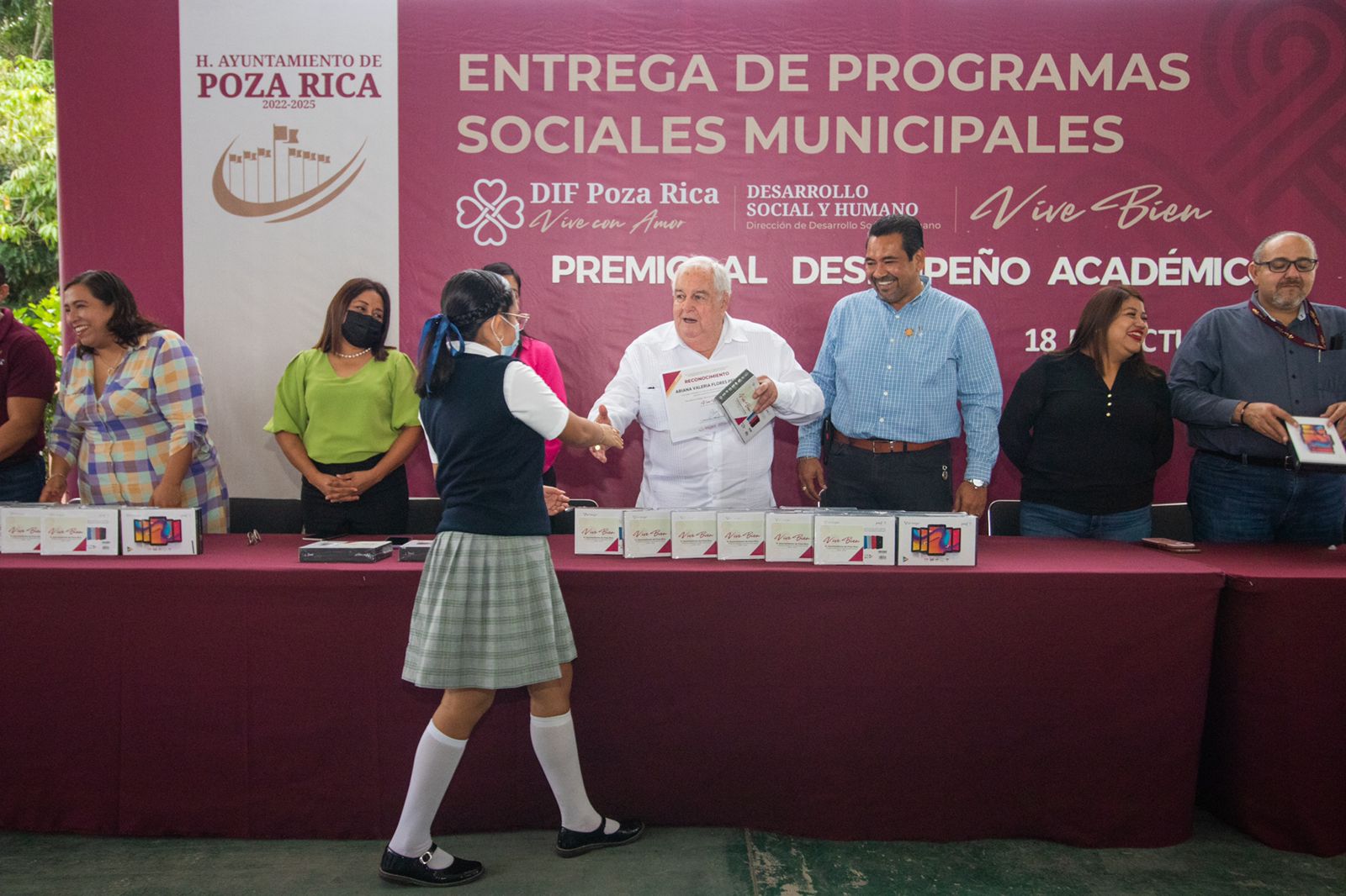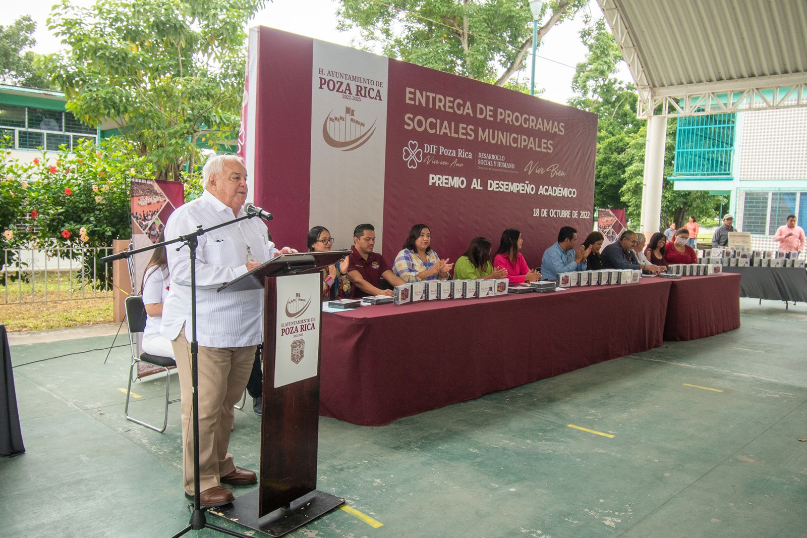 Poza Rica, Ver. – Como resultado de un trabajo coordinado entre el alcalde Fernando Remes Garza, integrantes del cuerpo edilicio y la Dirección de Desarrollo Social y Humano, se llevó a cabo la premiación al desempeño académico, en las instalaciones de la Esc. Sec. Gral. #1 Heriberto Jara Corona.