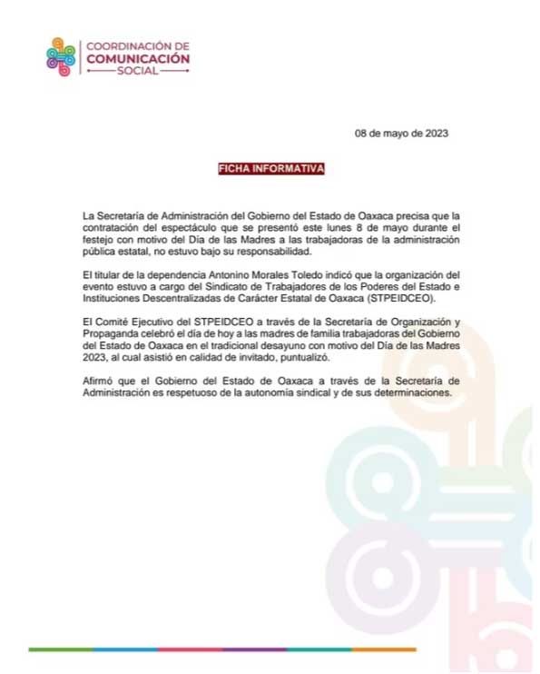 A través de un comunicado, se aclaró que el show previo al 10 de mayo fue contratado por El Sindicato de Trabajadores de los Poderes del Estado e Instituciones Descentralizadas de Carácter Estatal de Oaxaca (STPEIDCEO).