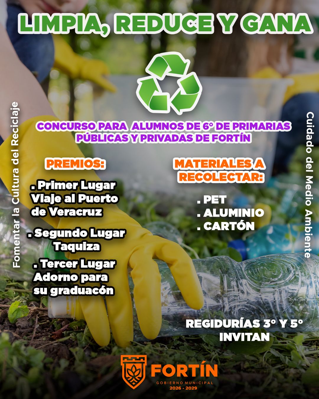 Fortín, Ver.- Para fomentar la cultura del reciclaje entre los alumnos de sexto grado de primaria, al tiempo de reconocer su esfuerzo con premios que celebren el cierre de su etapa escolar, el Ayuntamiento de Fortín, a través de las Regidurías Tercera y Quinta, encargadas de las comisiones de Limpia Pública y Educación, respectivamente, lanzó la campaña “Limpia, reduce y gana”.