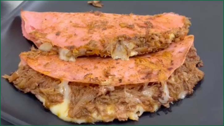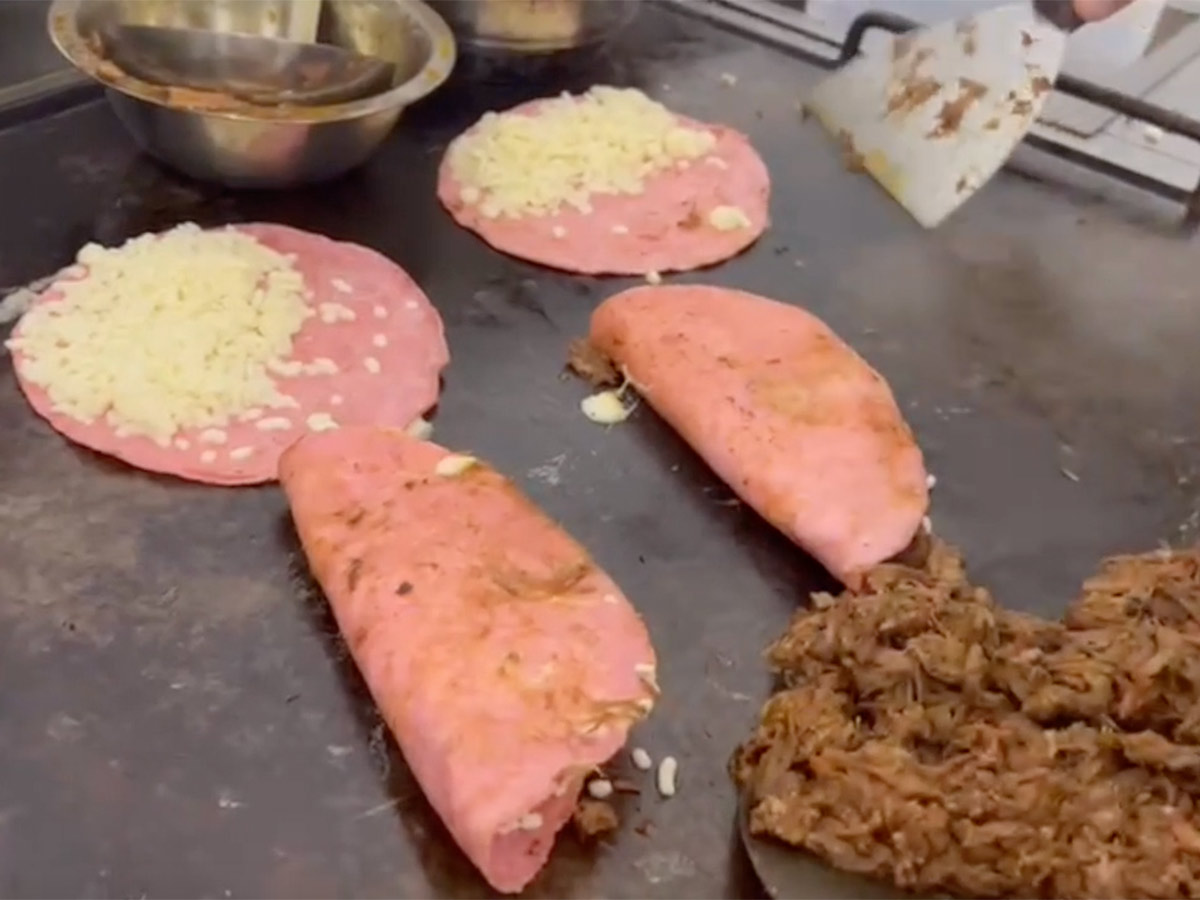 Viene siendo esta tortilla rosa, que es tortilla hecha a mano, pero lleva un toque de betabel que es lo que le da el color rosa a la quesabirria, a la quesabarbie y aunado a esto tiene un sabor diferente la tortilla”, apuntó su creador.
