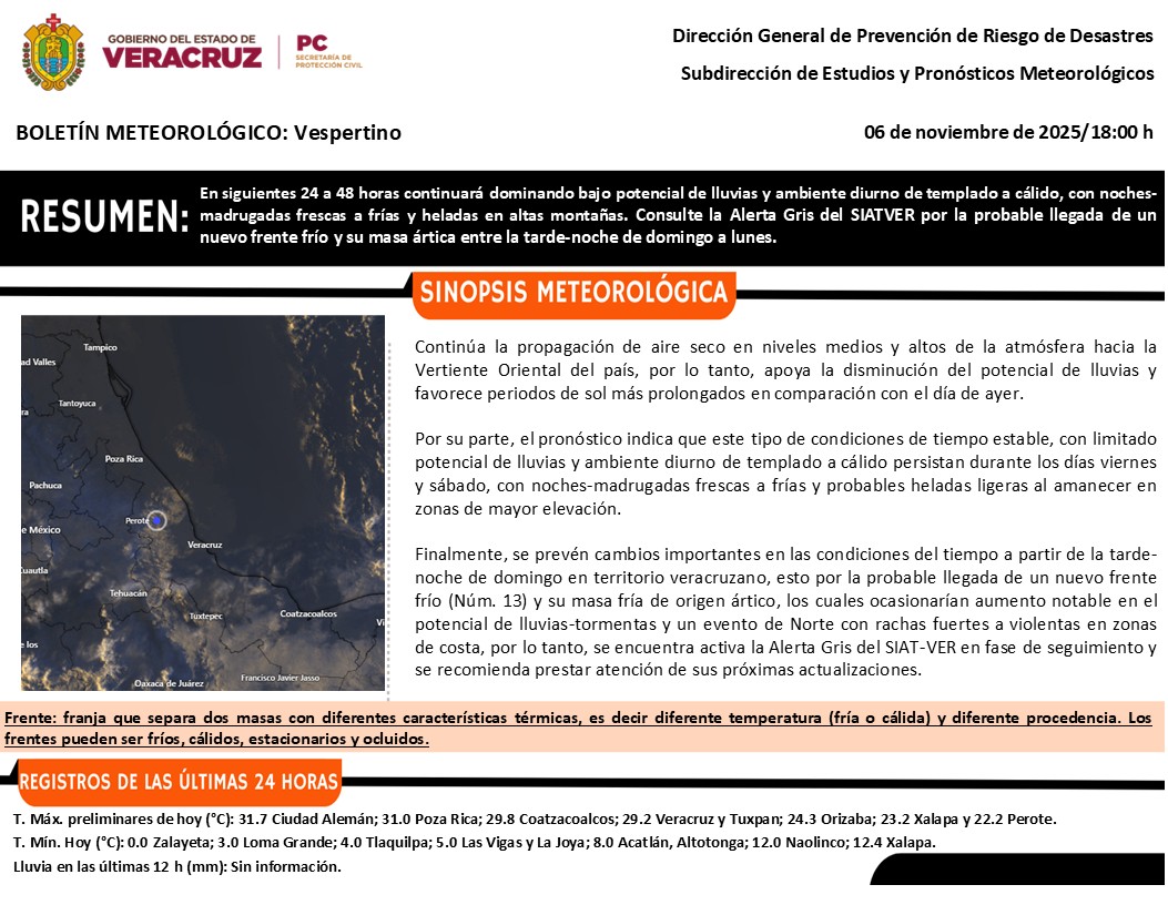 Veracruz se prepara para un marcado cambio de clima a partir del domingo, con un descenso notable de temperaturas, especialmente por las noches y madrugadas, y posibles heladas en zonas montañosas. Durante el fin de semana se mantendrá un ambiente templado a cálido durante el día, con cielos mayormente despejados y poca probabilidad de lluvias.