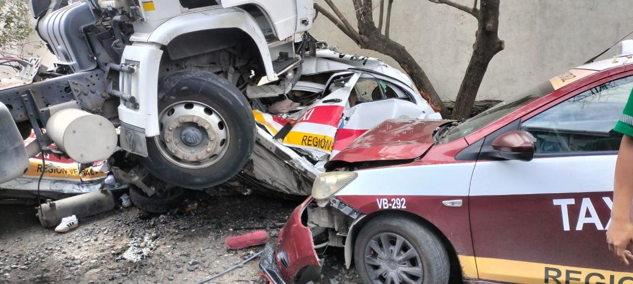 Dos taxistas que esperaban clientes, estacionados a orillas de la carretera federal 140, quedaron prensados entre los fierros retorcidos de sus unidades y del tracto camión cervecero, que los impactó tras chocar contra la camioneta que gris que casi se volcó.
