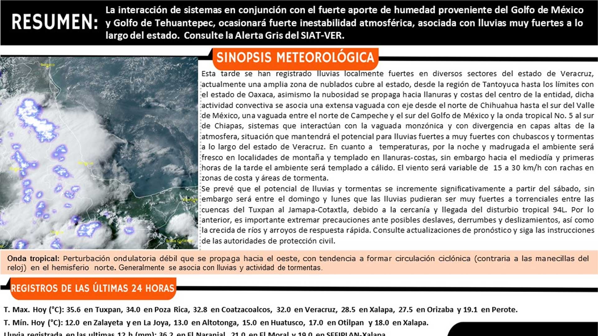 Se prevé que el potencial de lluvias y tormentas se incremente significativamente a partir del sábado, sin embargo será entre el domingo y lunes que las lluvias pudieran ser muy fuertes a torrenciales entre las cuencas del Tuxpan al Jamapa-Cotaxtla, debido a la cercanía y llegada del disturbio tropical 94L. Por lo anterior, es importante extremar precauciones ante posibles deslaves, derrumbes y deslizamientos, así como la crecida de ríos y arroyos de respuesta rápida.