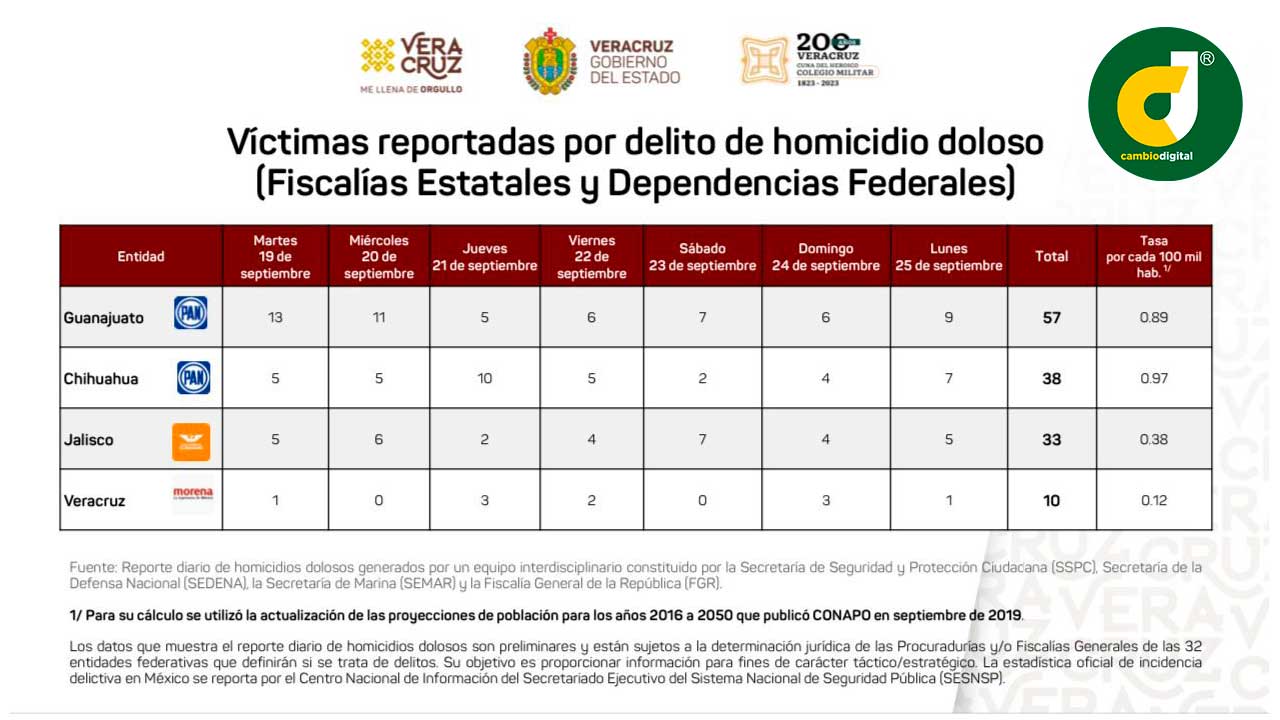 A lo anterior se suma la comparativa del 19 al 25 de septiembre, en la que Veracruz sumó 10 homicidios, a diferencia de Guanajuato que reportó 57 víctimas, destacó el gobernador de Veracruz, Cuitláhuac García Jiménez, a través de sus redes sociales. (https://n9.cl/zbl3n)