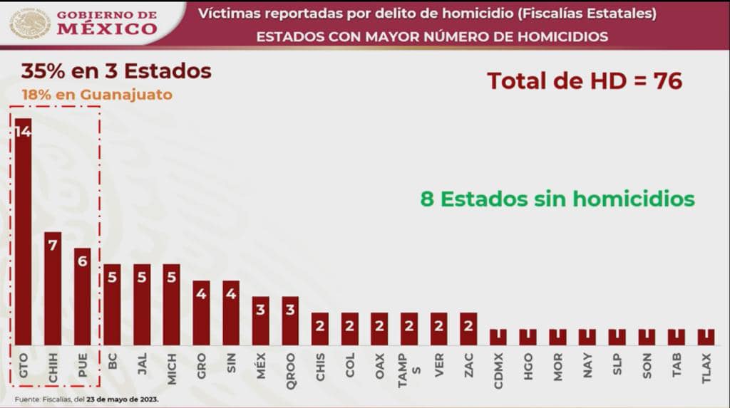 En la primera, siguen siendo seis las entidades que concentran casi la mitad (47.3%) de los casos (4 mil 688), estando Veracruz en el lugar 12 con 317 reportes; mientras que en el recuento de las pasadas 24 horas también Guanajuato y sus 14 homicidios lideran el índice delictivo.