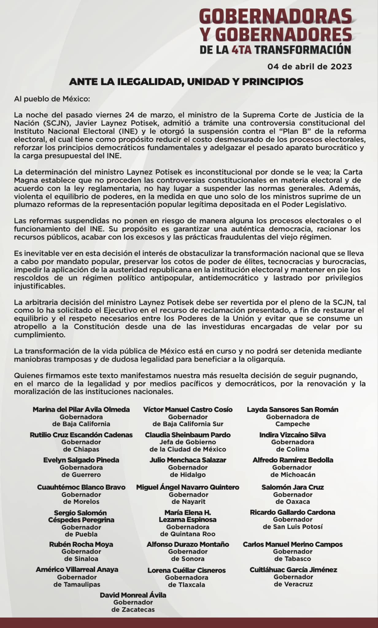“Ante la ilegalidad, unidad y principios”, manifestaron las gobernadoras, gobernadores y jefa de Gobierno de la Ciudad de México en misiva conjunta, afirmando que la resolución “es inconstitucional por donde se le vea y violenta el equilibrio de poderes”, pues uno solo de los ministros suprimió de un plumazo las “reformas de la representación popular legítima depositada en el Poder Legislativo”.