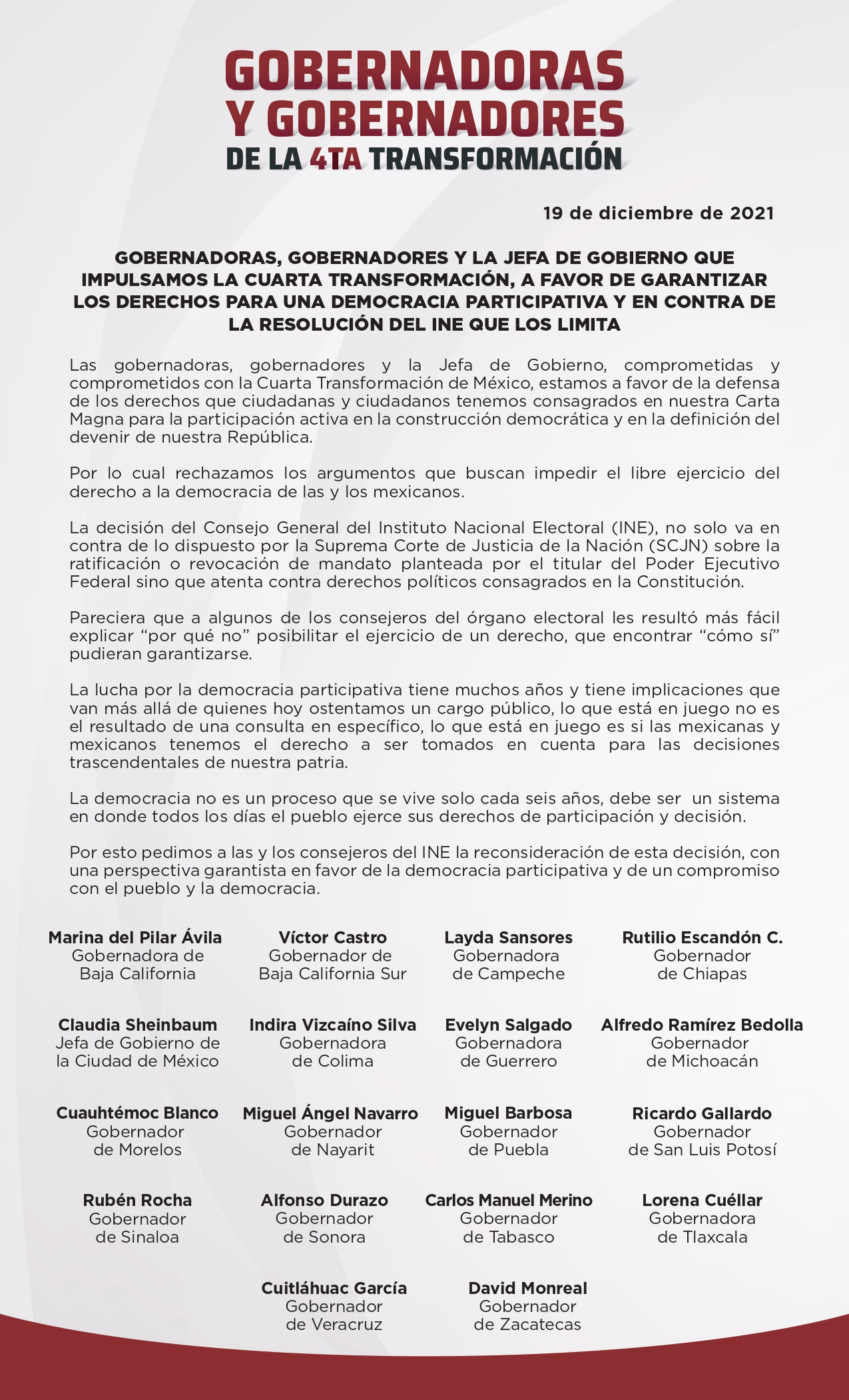 Las gobernadoras, gobernadores y la Jefa de Gobierno emanadas y emanados de MORENA, y comprometidas y comprometidos con la Cuarta Transformación de México, estamos a favor de la defensa de los derechos que ciudadanas y ciudadanos tenemos consagrados en nuestra Carta Magna para la participación activa en la construcción democrática y en la definición del devenir de nuestra República.
