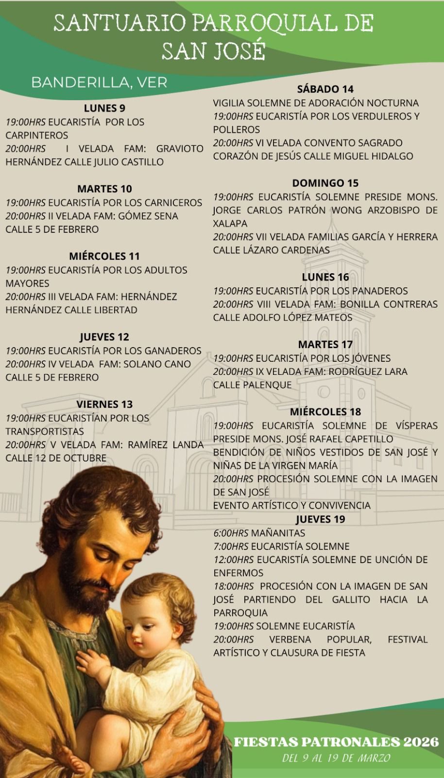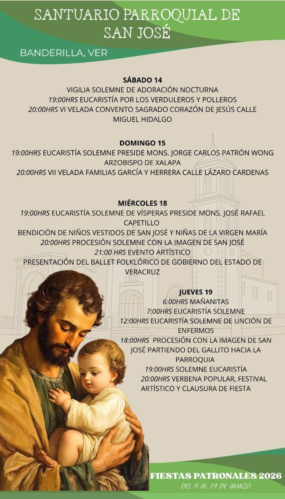 Banderilla, Ver.- En un esfuerzo coordinado entre el gobierno municipal y la comunidad católica del centro del estado, se realizará La Fiesta Patronal de Banderilla, Veracruz, en honor al Señor San José, cuyo calendario litúrgico y festivales artísticos y culturales comprenden del lunes 9 al domingo 22 de marzo del presente año.
