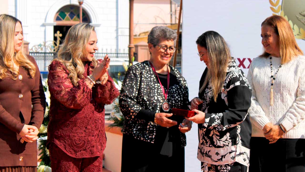 La alcaldesa Mayra Anel Delgado Castillo acompañada de la síndica Maritza González Ortiz y regidores hicieron la entrega de la medalla, junto a la diputada federal Denisse Guzmán González y de la diputada local Lucía Begoña Canales Barturen.