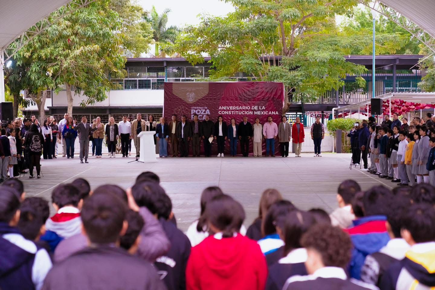 Poza Rica, Ver.— La Presidenta Municipal de Poza Rica, Adanely Rodríguez, encabezó el acto cívico conmemorativo del 109 aniversario de la promulgación de la Constitución Política de los Estados Unidos Mexicanos de 1917, acompañada del Director de la escuela secundaria general No. 1 “Heriberto Jara Corona”, Maximiliano Montano Martínez, integrantes del cuerpo edilicio, autoridades educativas y ciudadanía en general.