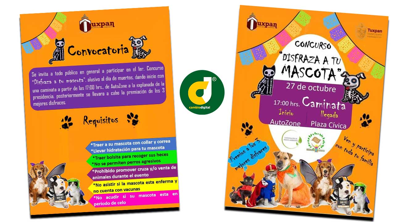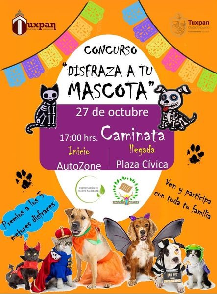 ¿Quieres disfrazar a tu mascota? El gobierno de Tuxpan que preside José Manuel Pozos Castro te invita al concurso de disfraces alusivo a Día de Muertos, que se realizará en la explanada de la Presidencia Municipal. Participar es gratuito y se premiará a los 3 mejores.