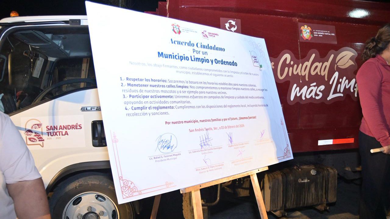 San Andrés Tuxtla, Ver., 3 de febrero de 2026.- El Ayuntamiento que encabeza el presidente municipal, Rafa Fararoni Magaña dio el banderazo de salida al nuevo programa de recolección de residuos y firmó el Acuerdo Ciudadano por una ciudad limpia y ordenada.