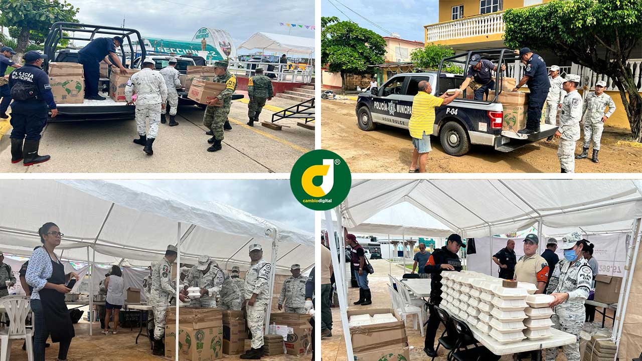 La Secretaría de Seguridad Pública mantiene activa la cocina móvil instalada en Agua Dulce, desde donde prepara alimentos calientes que son distribuidos con el apoyo de personal de la Sedena y Guardia Nacional.