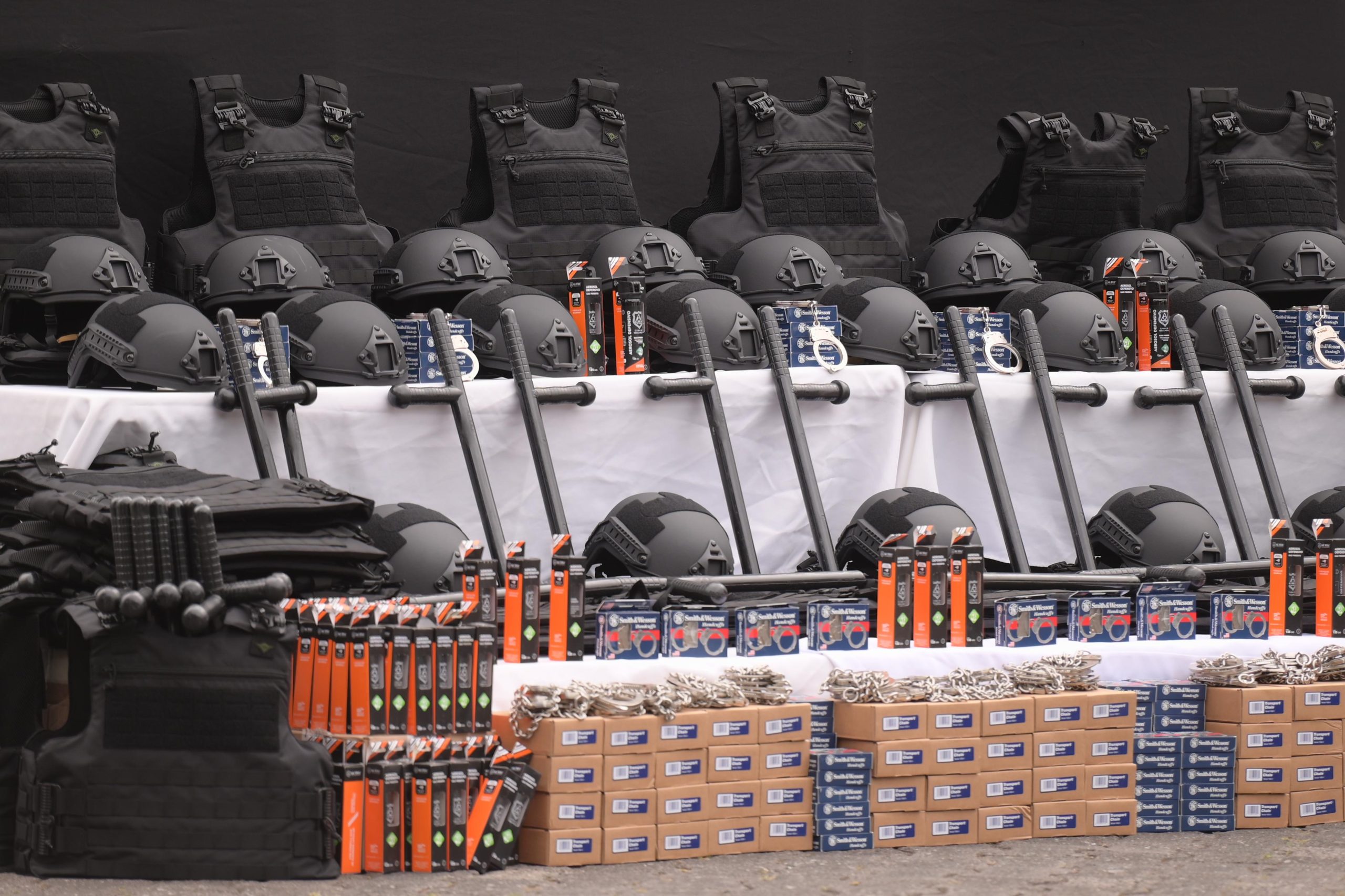 En el marco de la ceremonia, se entregó equipamiento y vehículos para reforzar las capacidades operativas y de respuesta inmediata, consistentes en 378 chalecos balísticos, 609 cascos balísticos, 765 esposas, 94 grilletes, 343 equipos de gas pimienta y toletes PR-24, así como unidades para el programa Veracruzana Protegida, dos camionetas tipo van para la unidad K9 y dos vehículos de trabajo tipo Bobcat.