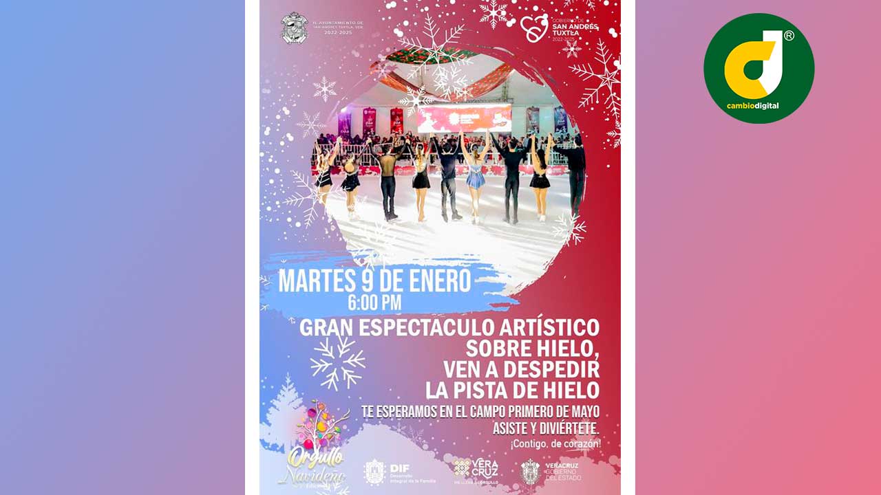 San Andrés Tuxtla, Ver.- Este martes 9 de enero ven a despedir la gran pista de hielo en el campo Primero de Mayo, el gobierno Municipal de San Andrés Tuxtla que preside la alcaldesa María Elena Solana Calzada, te invita a disfrutar en familia del espectáculo artístico sobre hielo gratuito a partir de las 6:00 de la tarde.