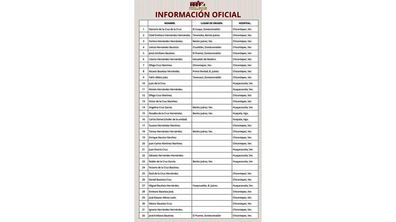 Zontecomatlán, Ver.- El ayuntamiento de Zontecomatlán dio a conocer una lista de 32 pasajeros del autobús 1700 de la línea Conexión que la tarde del 24 de diciembre sufrió un accidente en ese municipio que dejó una decena de personas muertas.