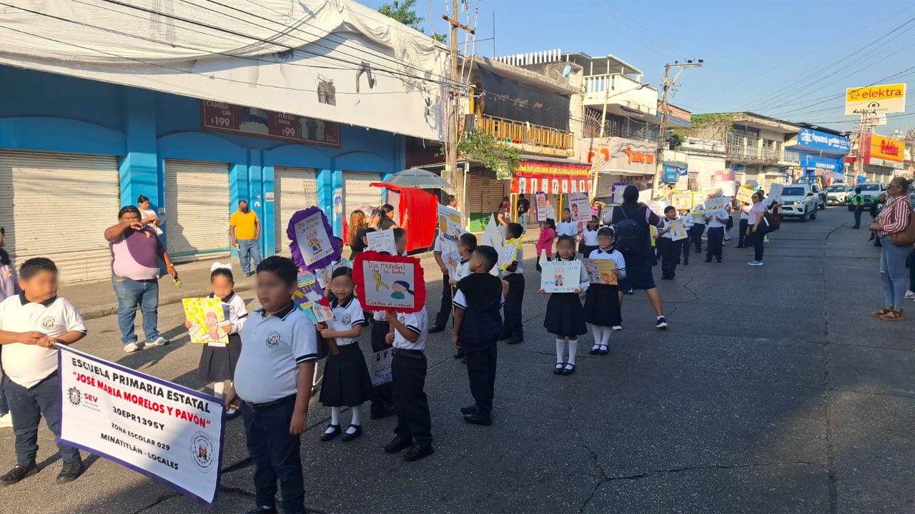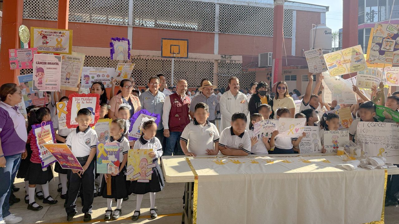 La actividad inició en el Palacio Municipal y concluyó en la Escuela Primaria Jose Maria Morelos y Pavon, donde se realizó una emotiva exposición de carteles y huellas, símbolo de apoyo y solidaridad hacia niñas, niños y familias que enfrentan el cáncer infantil.