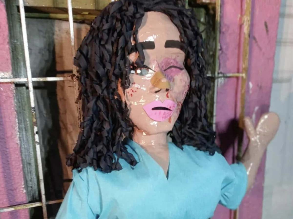 La piñata de la creadora de contenidos aparece con una bata azul como de hospital, sus rizos de color negro, un ojo cerrado y con salpicaduras de lo que asemeja la sangre.