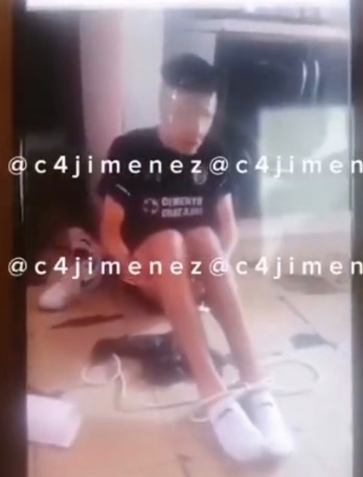 En el material audiovisual que circula en redes sociales se observa a un hombre sentado en el piso sin zapatos, en short y playera, concita adhesiva en al cara y las piernas atadas con un lazo.