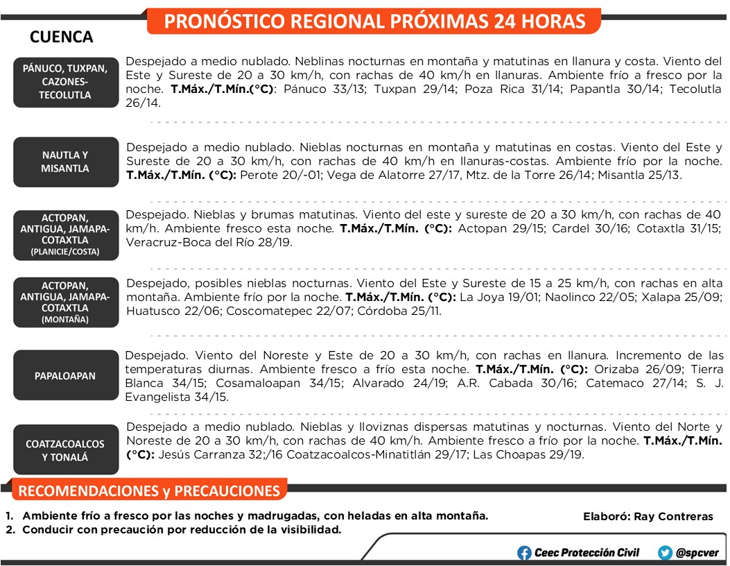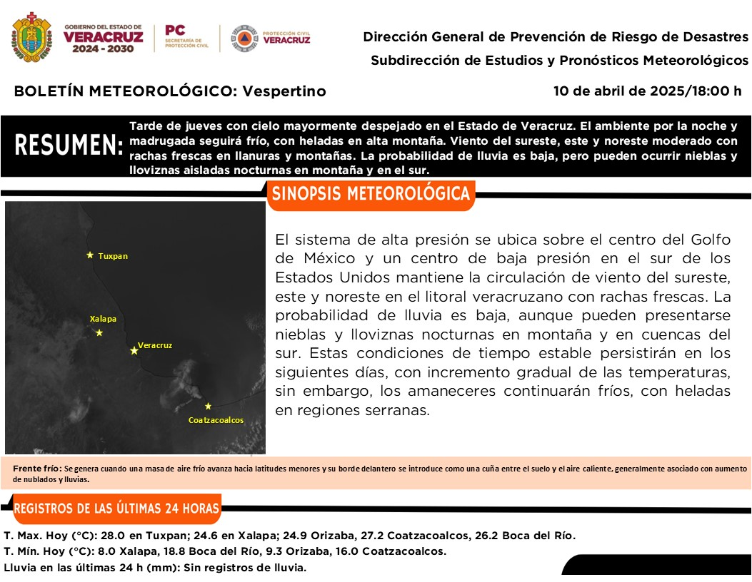 Un sistema frontal se moverá al norte del Golfo de México el viernes, y el sábado alcanzará el centro y sureste del golfo, favoreciendo viento del noreste y norte con rachas frescas en la entidad. Así como desarrollo de nublados con nieblas y lloviznas dispersas. Las temperaturas tendrán poco cambio, ambiente diurno relativamente cálido, pero frío a fresco por la noche y madrugada.