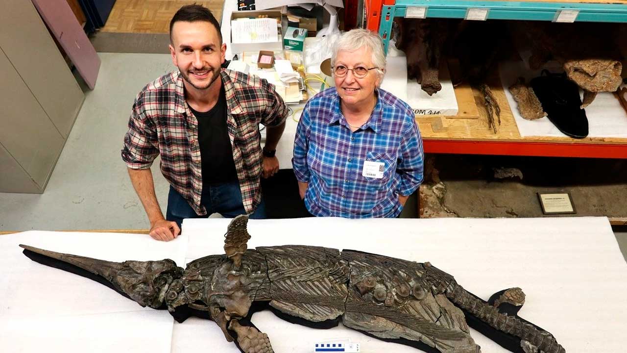 El esqueleto, que pertenece al Museo Real de Ontario, en Canadá, incluye un cráneo con una órbita (ojo) enorme y un largo hocico en forma de espada.