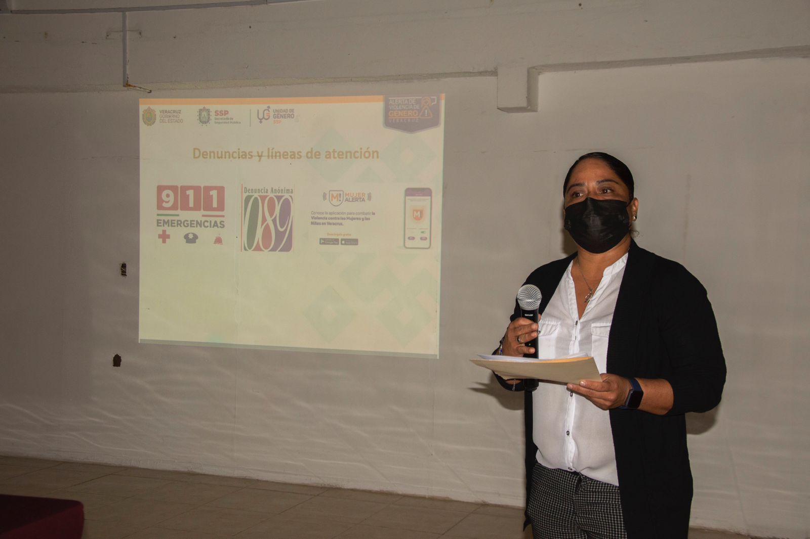 La licenciada Regina Díaz Hernández, de enlace y vinculación institucional en la Delegación de Fuerza Civil Región 2 de Tuxpan abordó los temas de igualdad, discriminación como delito, así como las diferentes aplicaciones móviles que existen para denunciar.