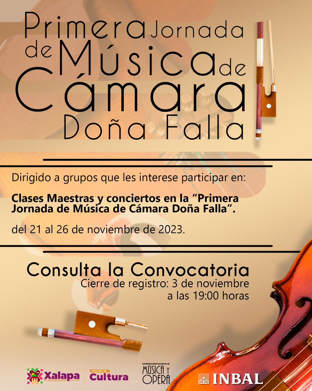 Xalapa, Ver.- Para motivar la práctica, el estudio de la música de cámara y apoyar a nuevos talentos, el Ayuntamiento, a través de la Dirección de Cultura, llevará a cabo la Primera Jornada de Música de Cámara Doña Falla, del 21 al 26 de noviembre en el Museo de la Música Veracruzana, la cual está dirigida a niños y jóvenes con formación en esta disciplina artística.