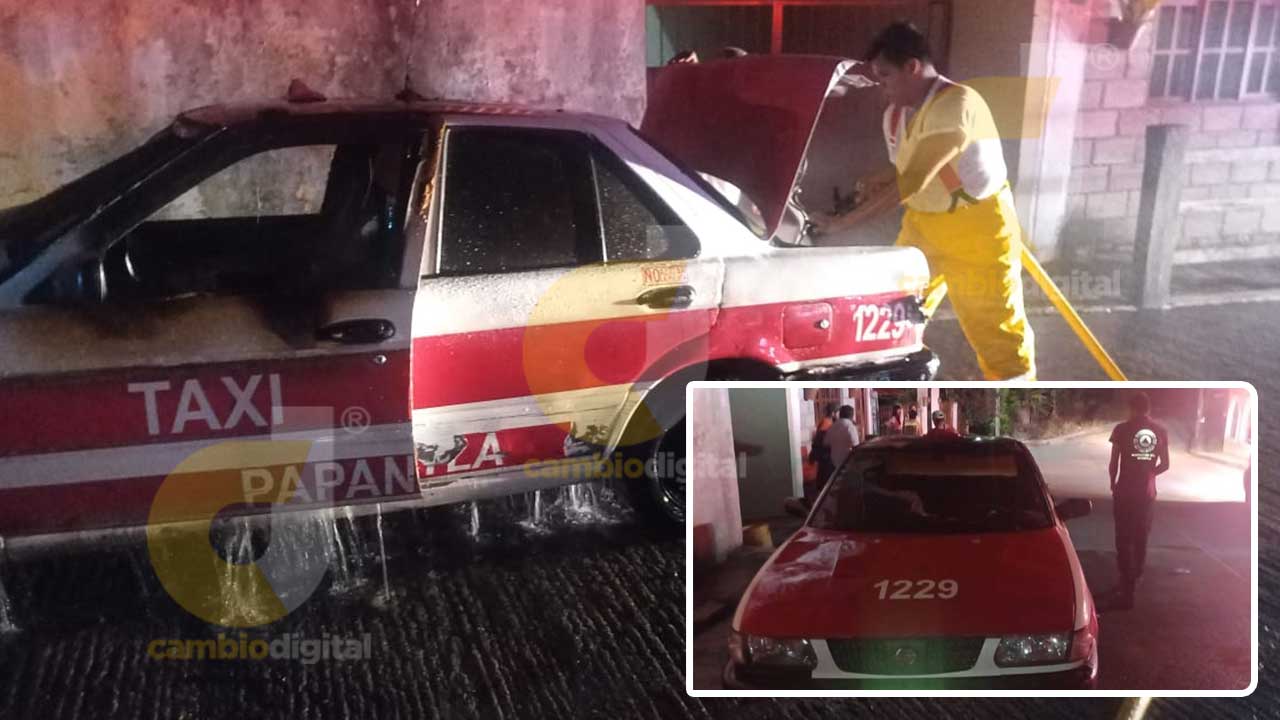 Papantla, Ver.-En las primeras horas de este sábado sujetos desconocidos rociaron de combustible la unidad de alquiler de este municipio con número económico 1229 ocasionando un fuerte incendio en el taxi.