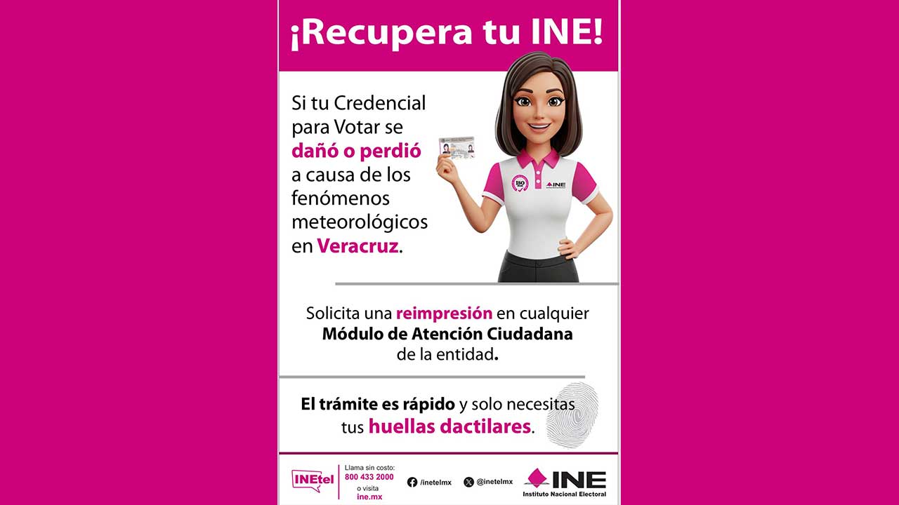 Veracruz, Ver.- El Instituto Nacional Electoral (INE) a través de la 12 Junta Distrital Ejecutiva en Veracruz, informa a la ciudadanía que, con motivo de las recientes afectaciones por fenómenos naturales en diversas zonas de la entidad, se ha puesto a disposición el servicio de reimpresión de credencial para votar para todas aquellas personas damnificadas que hayan perdido o sufrido daños en su documento. Este trámite no implica cambio de datos y se entrega una credencial idéntica a la anterior, con la misma vigencia, únicamente para reponerla por robo, extravío o deterioro grave.