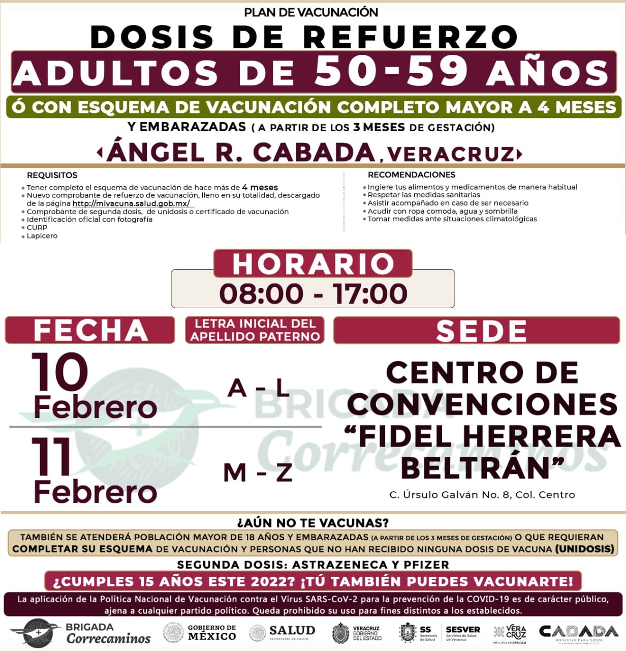 Ángel R. Cabada, Ver.- El ayuntamiento de Ángel R. Cabada a través de redes sociales informa a la población de la vacunación de refuerzo contra Covid-19 para adultos de 50-59 años, mujeres embarazadas y adolescentes de 15 a 18 años.