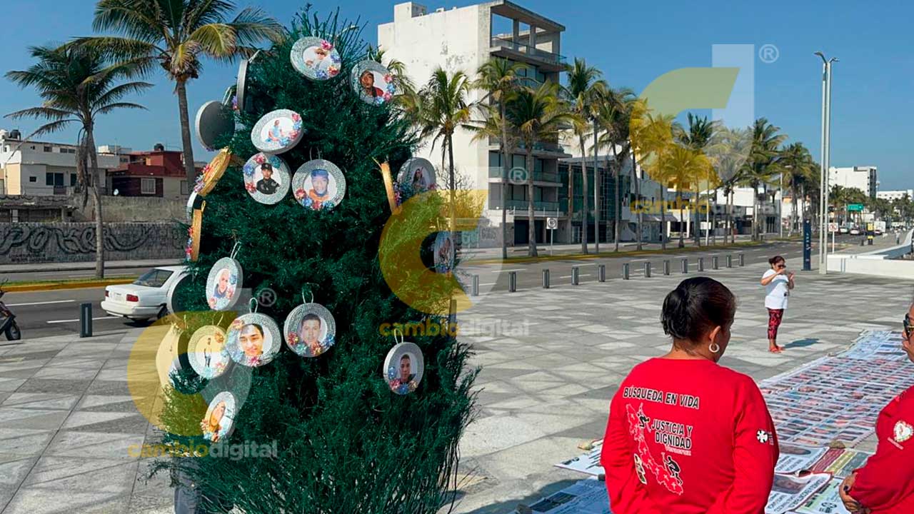 Veracruz, Ver.- En memoria de las personas desaparecidas, y demanda para que se dé celeridad a la búsqueda y la identificación de los miles de restos humanos recuperados en fosas clandestinas de Veracruz, integrantes del colectivo Justicia y Dignidad Veracruz, instalaron el “Arbolito de la ausencia” en la Plaza de la Soberanía del bulevar Manuel Ávila Camacho de la ciudad de Veracruz.