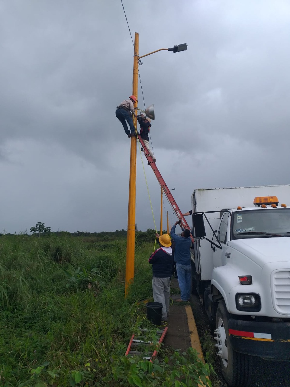 Nanchital, Ver.- Siguiendo las indicaciones de la alcaldesa, Esmeralda Mora Zamudio, este día personal del departamento de Alumbrado Público y Protección Civil, llevaron a cabo la instalación de un reflector en el área acordonada, en la carretera cuatro carriles.