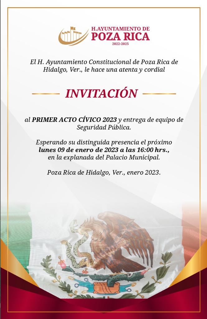 Poza Pica, Ver.- El ayuntamiento de Poza Rica que encabeza el alcalde Fernando Remes hace una cordial invitación al primer acto cívico de este 2023 a realizarse este lunes 9 de enero en la explanada del Palacio Municipal.