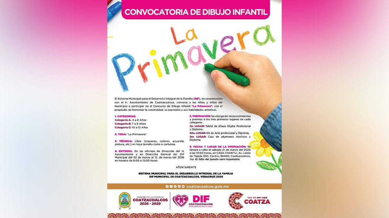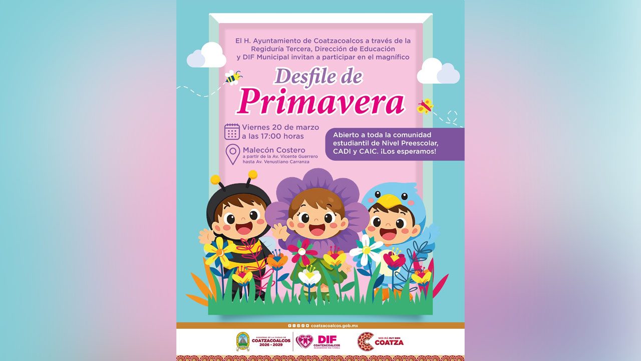 Coatzacoalcos, Ver.- La presidenta del Sistema DIF Municipal de Coatzacoalcos, Sonia Marie Salvador Goraieb, invitó a la comunidad estudiantil de nivel preescolar, así como a los Centros de Asistencia de Desarrollo Infantil (CADI) y Centros de Atención Infantil Comunitario (CAIC), a participar en el tradicional ‘Desfile de Primavera 2026’ y en el concurso de dibujo alusivo a la fecha.