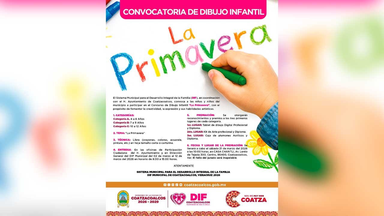 Respecto al concurso de dibujo, enfatizó que el tema principal será la primavera y también está dirigido a los niños de preescolar y primaria con tres categorías: A, de 4 a 6 años; B, de 7 a 9 años; y C, de 10 a 12 años. La convocatoria también inicia este lunes 2 y termina el jueves 12 de marzo.