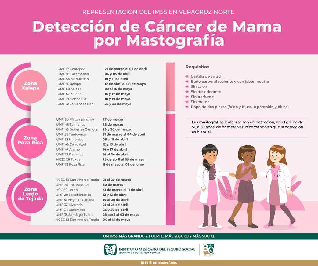 Xalapa, Ver.- El Instituto Mexicano del Seguro Social (IMSS) en Veracruz Norte, a través de la Coordinación de Prevención y Promoción a la salud, realiza una cordial invitación a todas aquellas mujeres, de 50 a 69 años de edad, a acudir a las unidades móviles de detección de cáncer de mama para realizarse su mastografía.