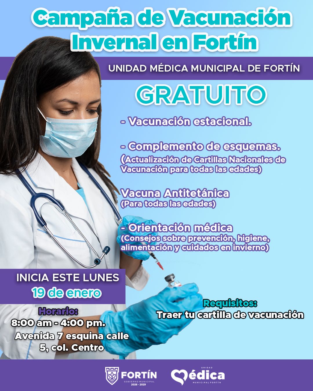 Para prevenir factores de riesgo por enfermedades relacionadas con las vías respiratorias, la Unidad Médica Municipal Fortín (UMMF), este lunes 19 de enero, iniciará la Campaña de Vacunación Invernal, con el objetivo de salvaguardar la salud de los fortinenses ante las bajas temperaturas que prevalecen en la zona.