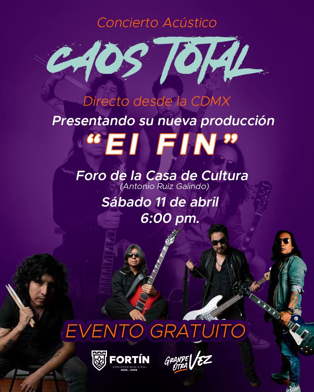 Fortín, Ver.- Para reafirmar el compromiso con la promoción cultural y el fortalecimiento de la identidad comunitaria, el Ayuntamiento de Fortín que encabeza el alcalde, Lic. Alfonso Efraín “Piccolo” Marín Delfín, invita al Concierto Acústico de la Banda de Rock “Caos Total”, quienes compartirán con el público su producción titulada “El fin” que incluye 8 temas de autoría.