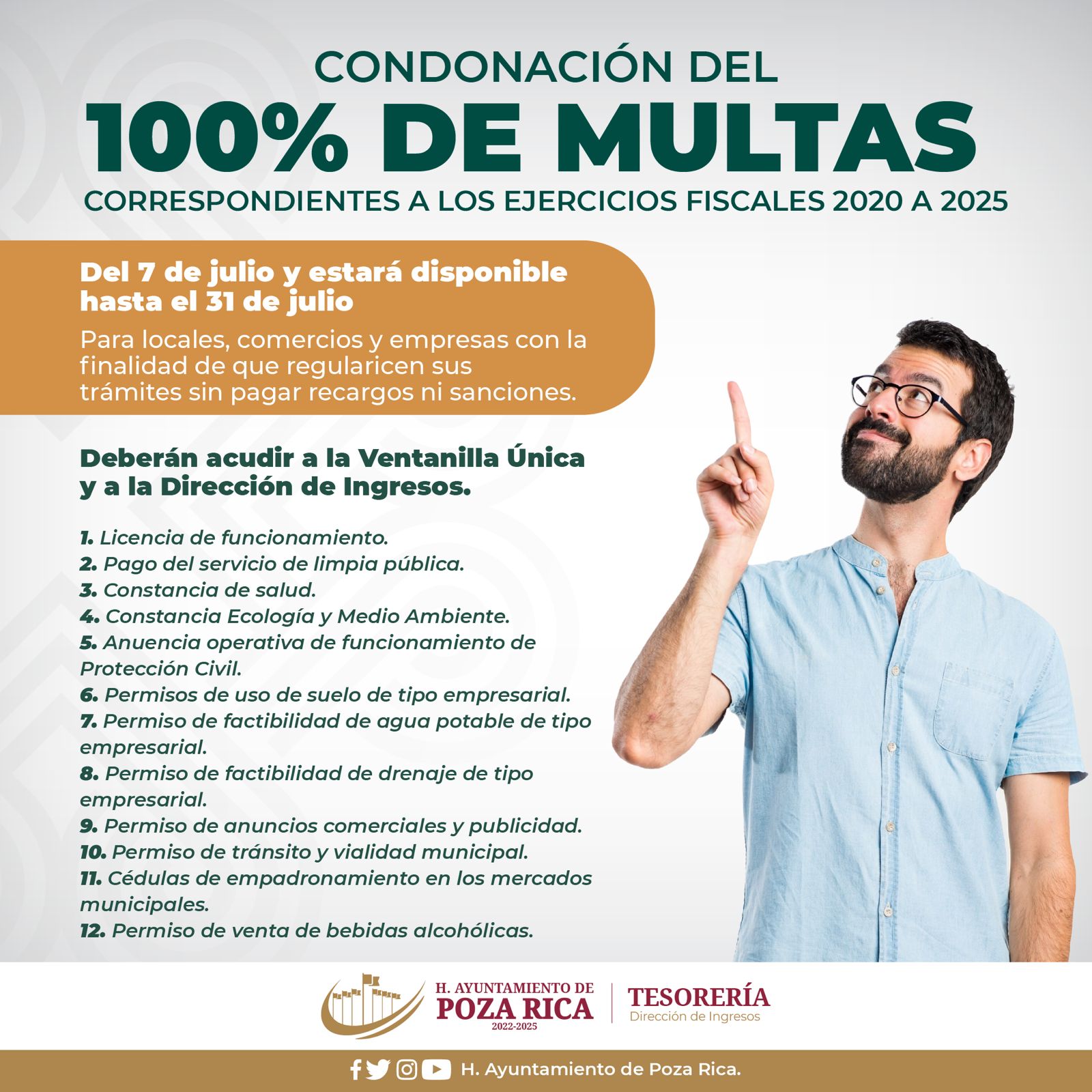 Poza Rica, Ver. – Como parte de las acciones para impulsar la economía local y promover la regularización de unidades económicas en el municipio, el cuerpo edilicio de Poza Rica, encabezado por el presidente municipal Fernando Remes Garza, aprobó en sesión de Cabildo la condonación del 100% de multas correspondientes a los ejercicios fiscales 2020 a 2025.