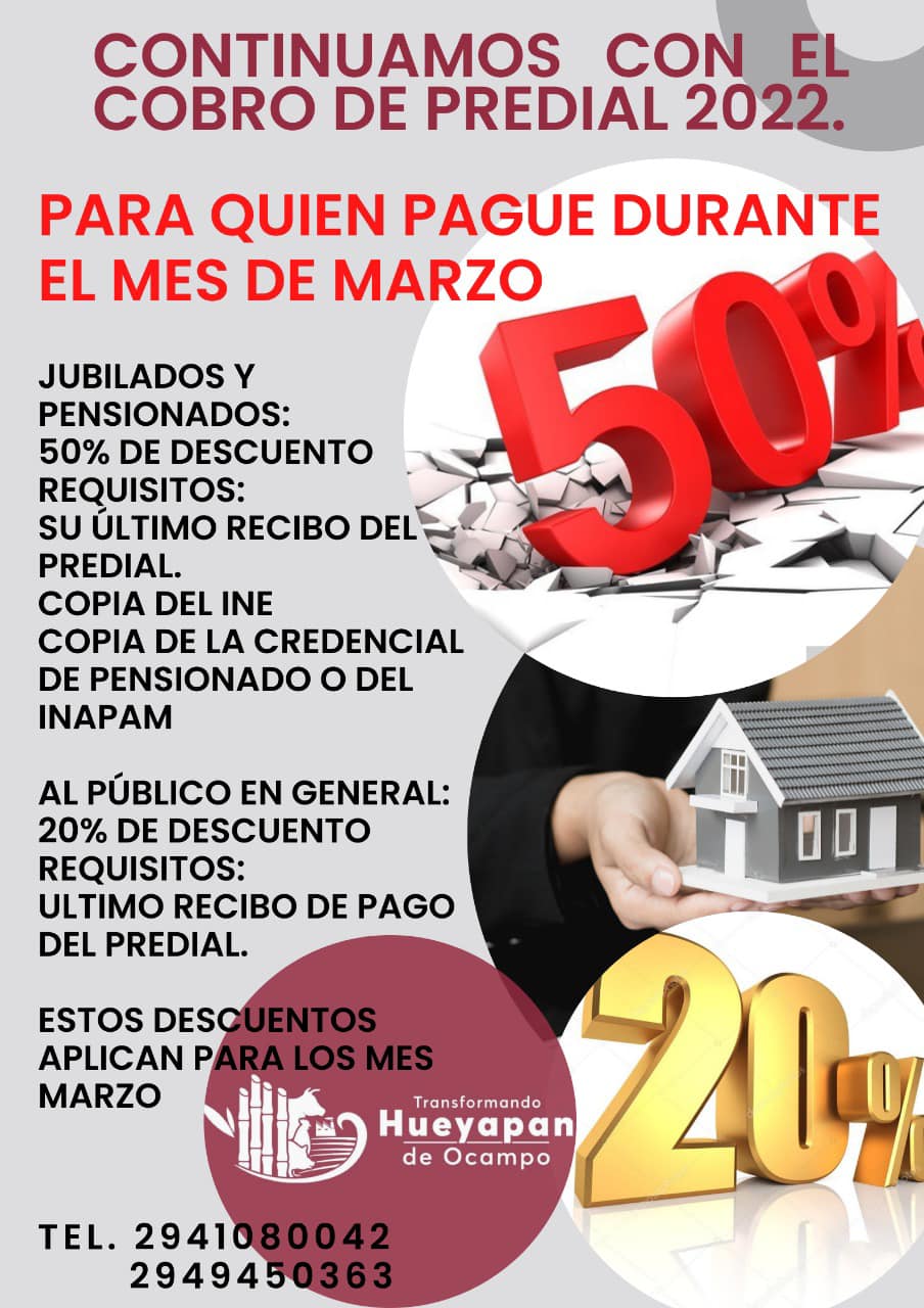 Hueyapan de Ocampo, Ver.- El ayuntamiento de Hueyapan de Ocampo informa a todos los contribuyentes que no han pagado el impuesto predial que aún pueden aprovechar los descuentos en este mes de marzo.